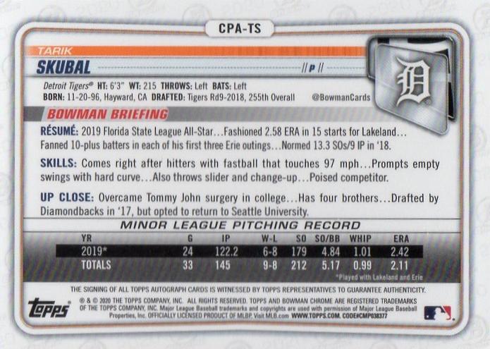 2020 Topps Bowman Tarik Skubal Autographs 020/299