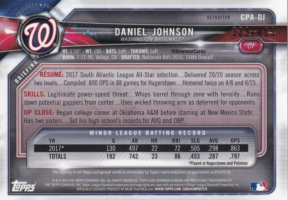 2018 Topps Bowman Chrome Draft Washington Nationals Daniel Johnson Autographs Refractorsパラレル版 333/499