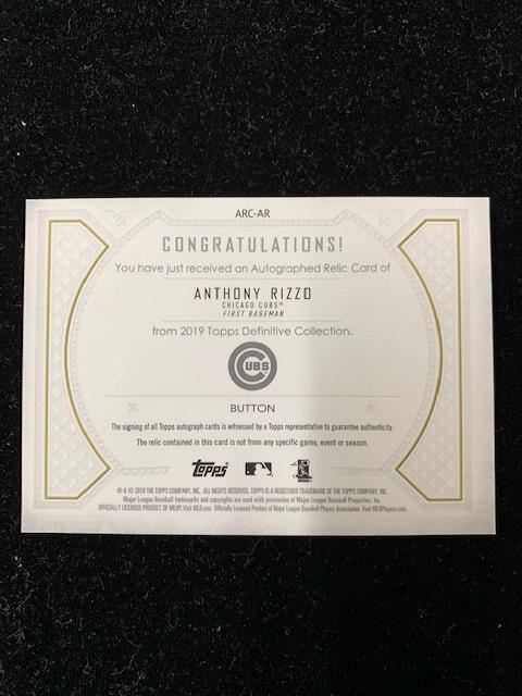 2019 Topps Definitive Collection Chicago Cubs Anthony Rizzo Autograph Relics Red Jersey Button(1of1) 1/1