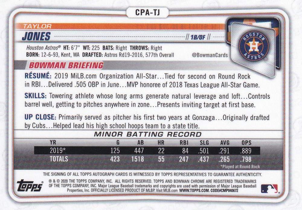 2020 Topps Bowman Chrome Houston Astros Taylor Jones Prospect Autographs