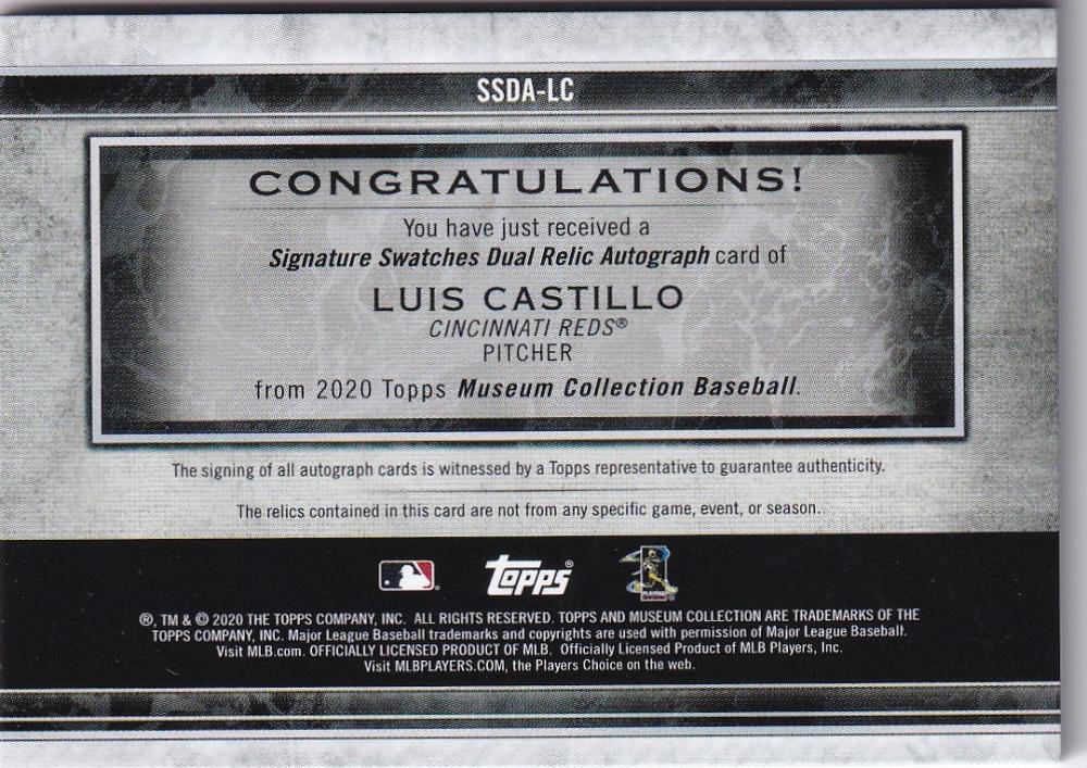 2020 Topps Museum Collection Cincinnati Reds Luis Castillo Signature Swatches Dual Relic Autographs 091/299