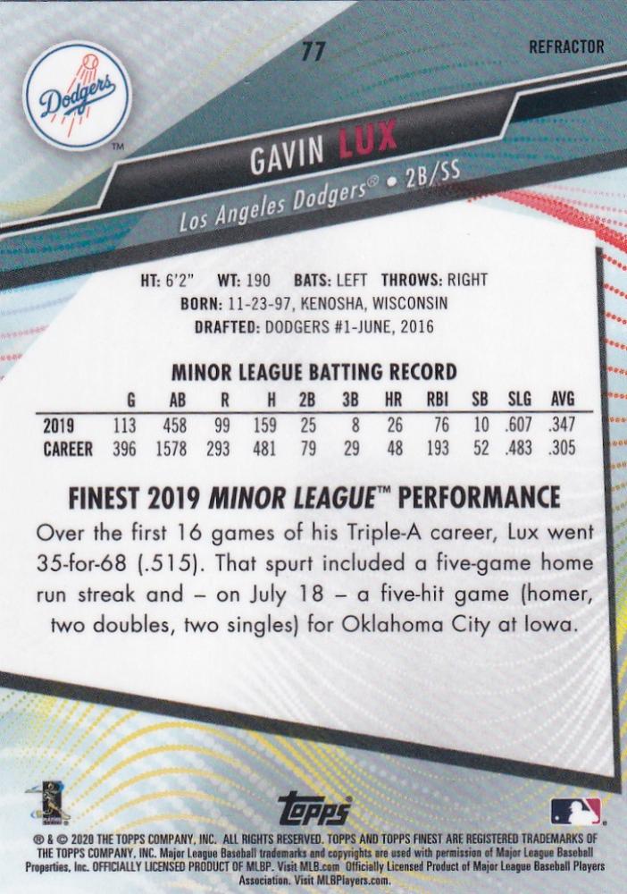 2020 Topps Finest Los Angeles Dodgers Gavin Lux Base Refractorsパラレル版