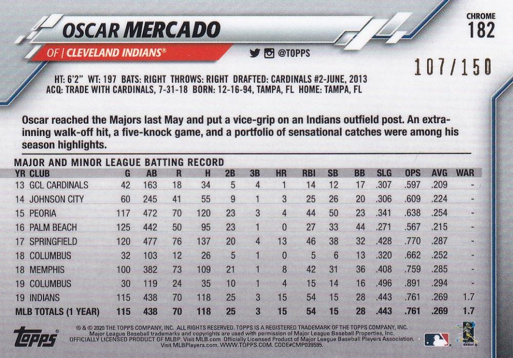 2020 Topps Chrome Cleveland Indians Oscar Mercado Base Blue Refractorsパラレル版 107/150