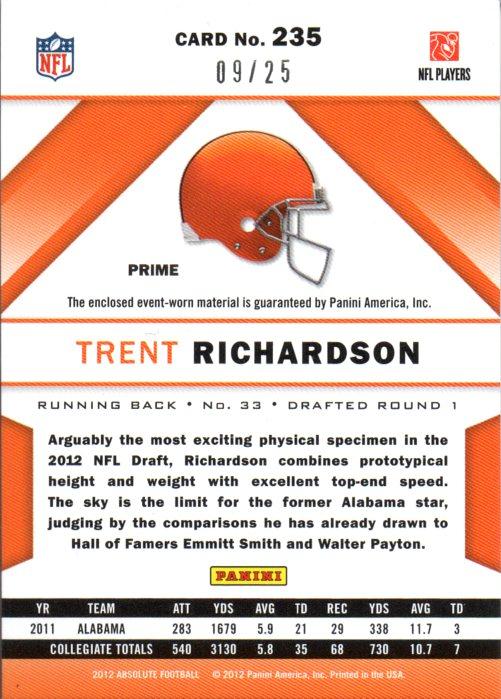 2012 PANINI Absolute Trent Richardson Event Worn Material 09/25