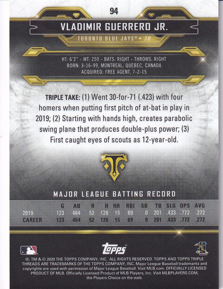 2020 Topps Triple Threads Toronto Blue Jays Vladimir Guerrero Jr. Base Amberパラレル版 165/199