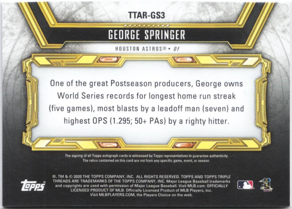 2020 TOPPS Triple Threads George Springer Triple Threads Autograph Relic Sapphire 3枚限定 /2