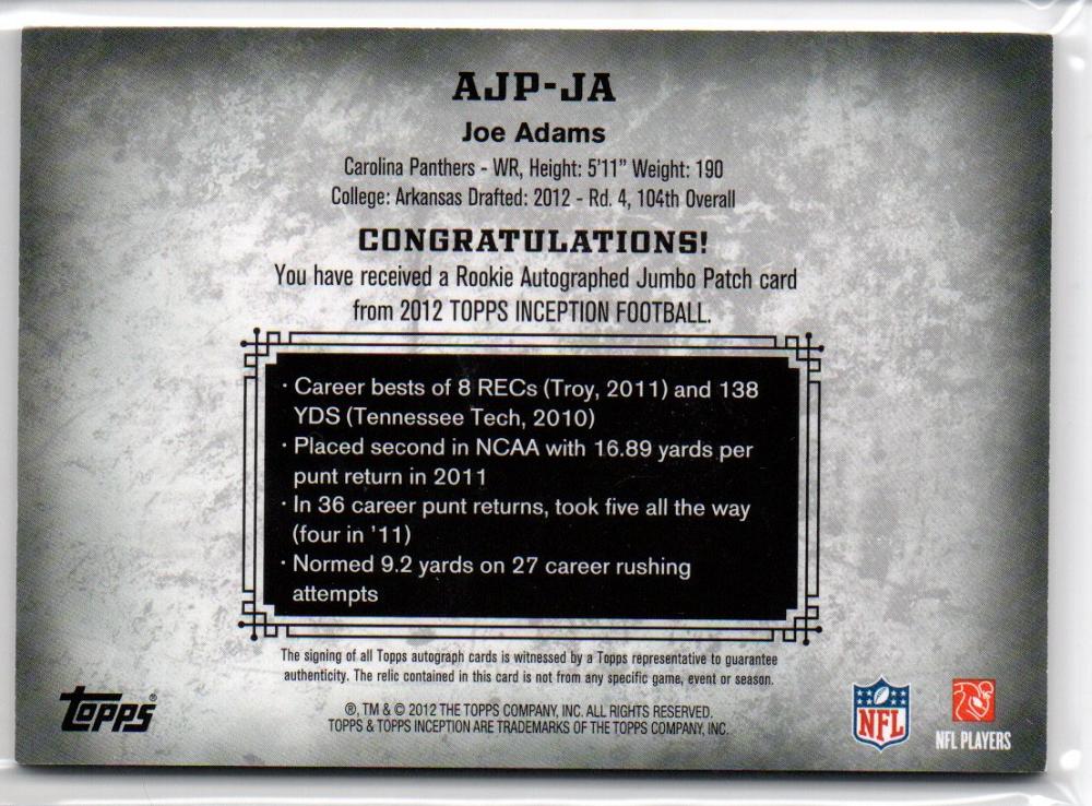 2012 Topps Inception Joe Adams Rookie Jumbo Patch Autographs ※表面欠けあり