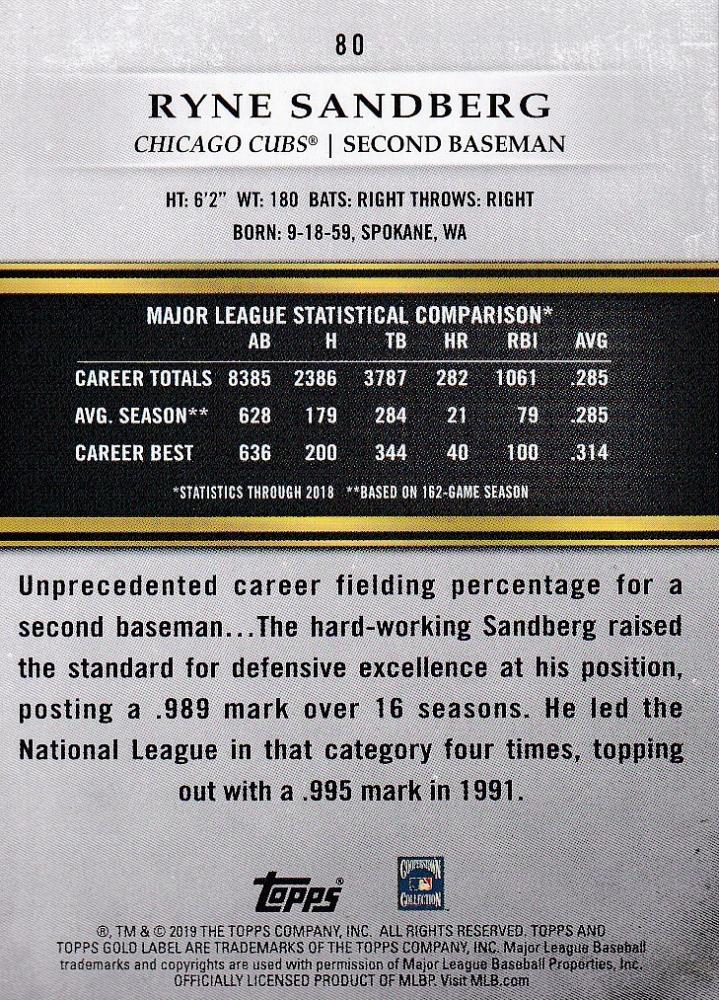 2019 Topps Gold Label Chicago Cubs Ryne Sandberg Base Class2 Blue パラレル版 13/99