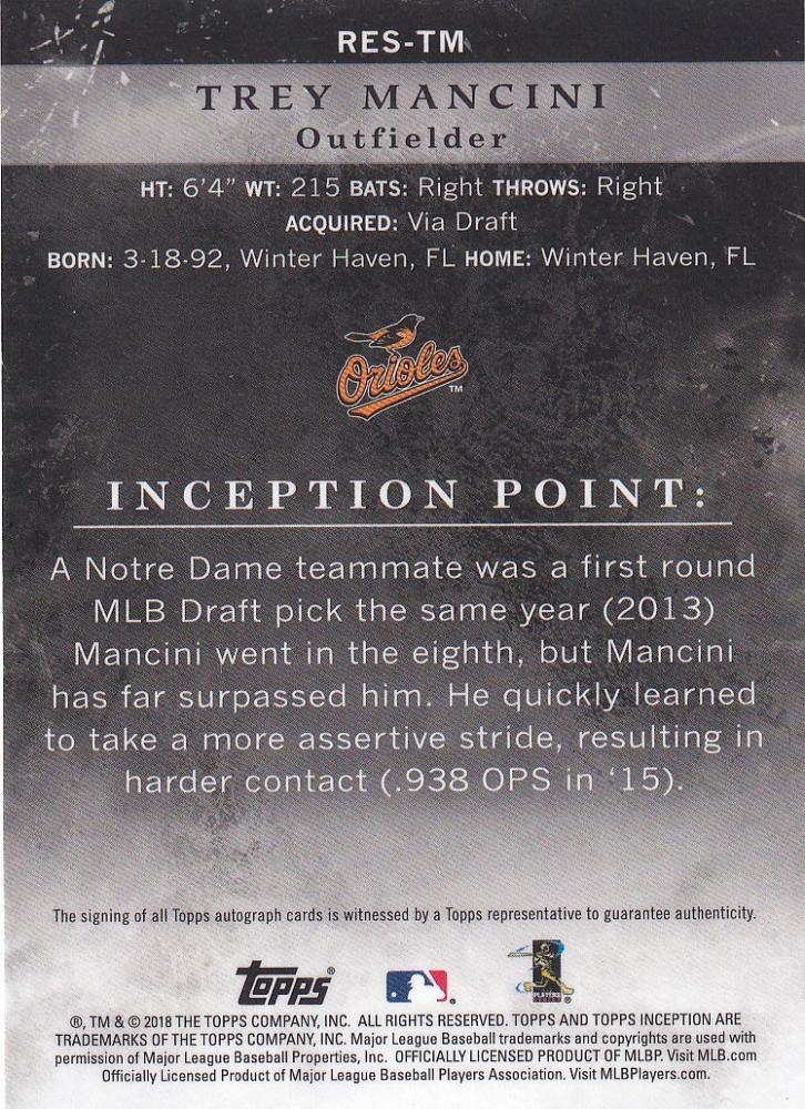 2018 Topps Inception Baltimore Orioles Trey Mancini Rookies and Emerging Stars Autographs Magenta パラレル版 65/99
