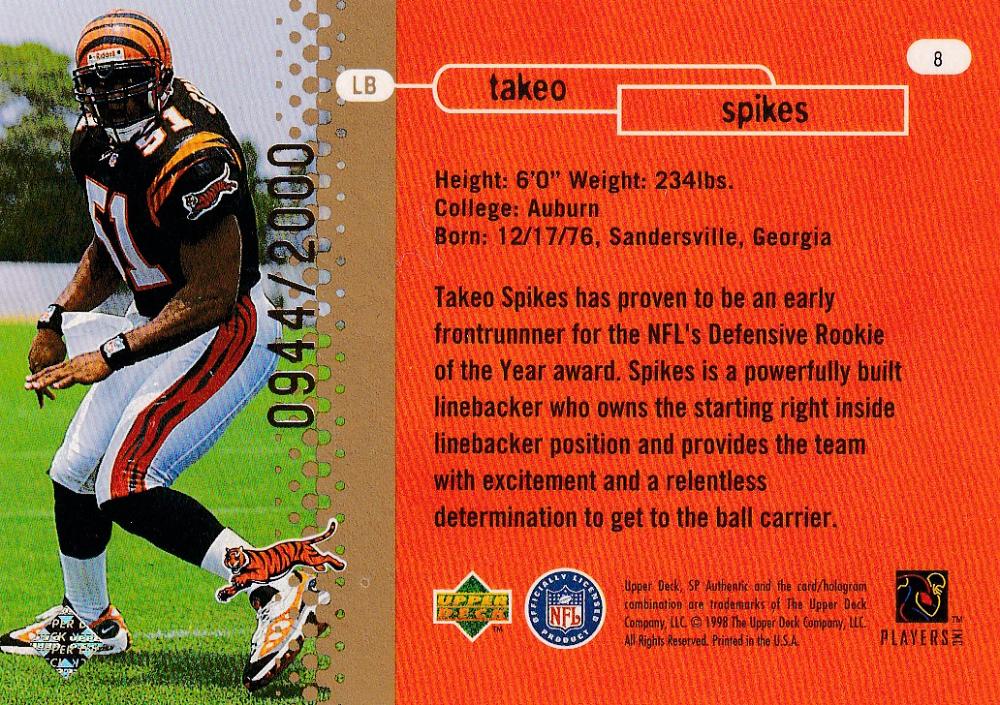 ※縁焼け有 画像参照 1998 SP Authentic Cincinnati Bengals Takeo Spikes #8 0944/2000