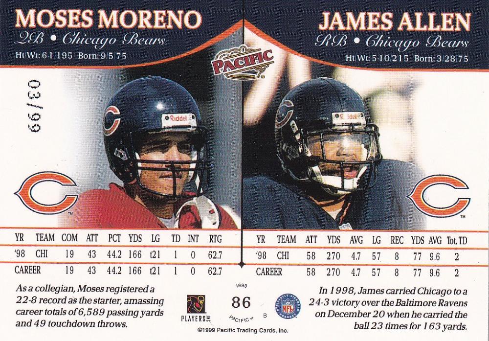 ※縁焼け有 画像参照 1999 Pacific Chicago Bears Moses Moreno/James Allen #86 Copper パラレル版 03/99
