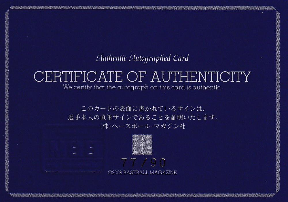 2008 BBM オリックスバファローズ 村松有人 直筆サインカード 77/90