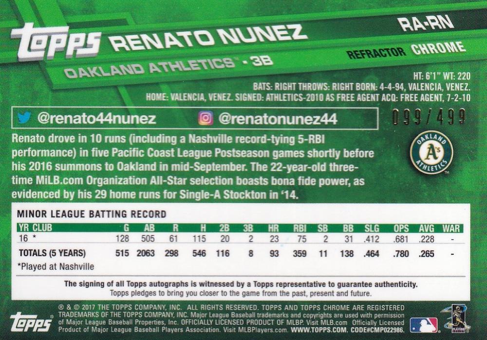 2017 Topps Chrome Oakland Athletics Renato Nunez Rookie Autographs Refractors (パラレル版) 099/499