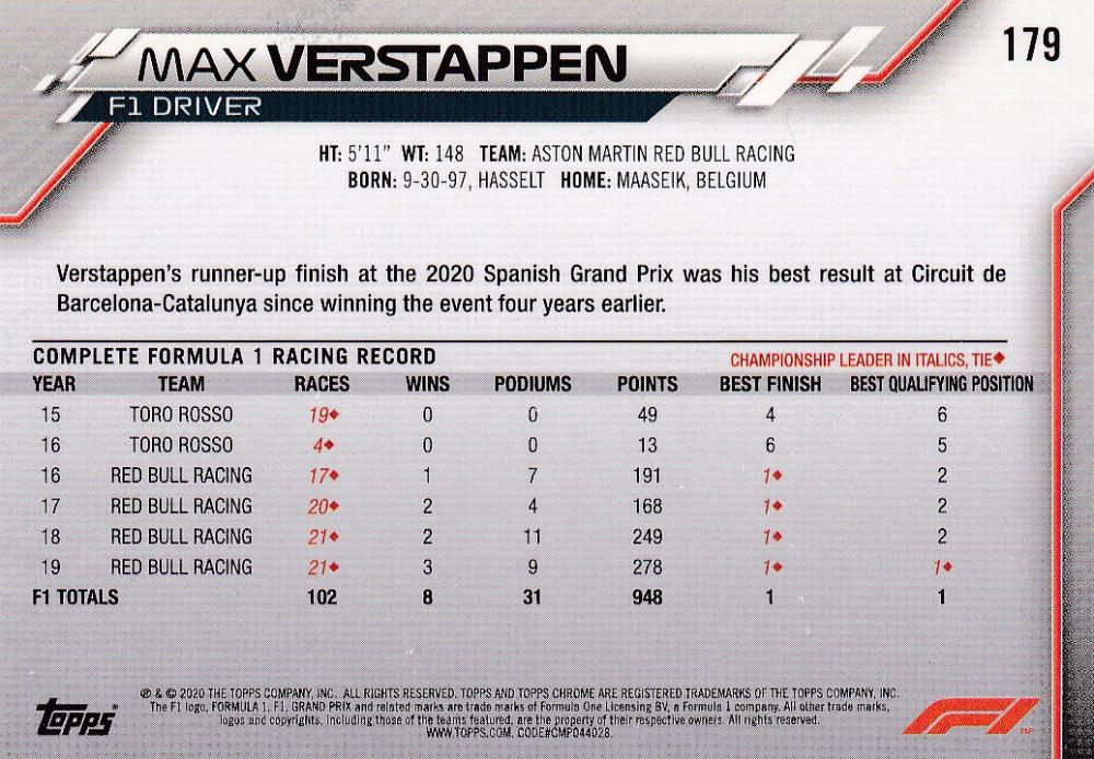 2020 Topps Chrome Formula 1 Aston Martin RB Racing Max Verstappen F1 Racers Base