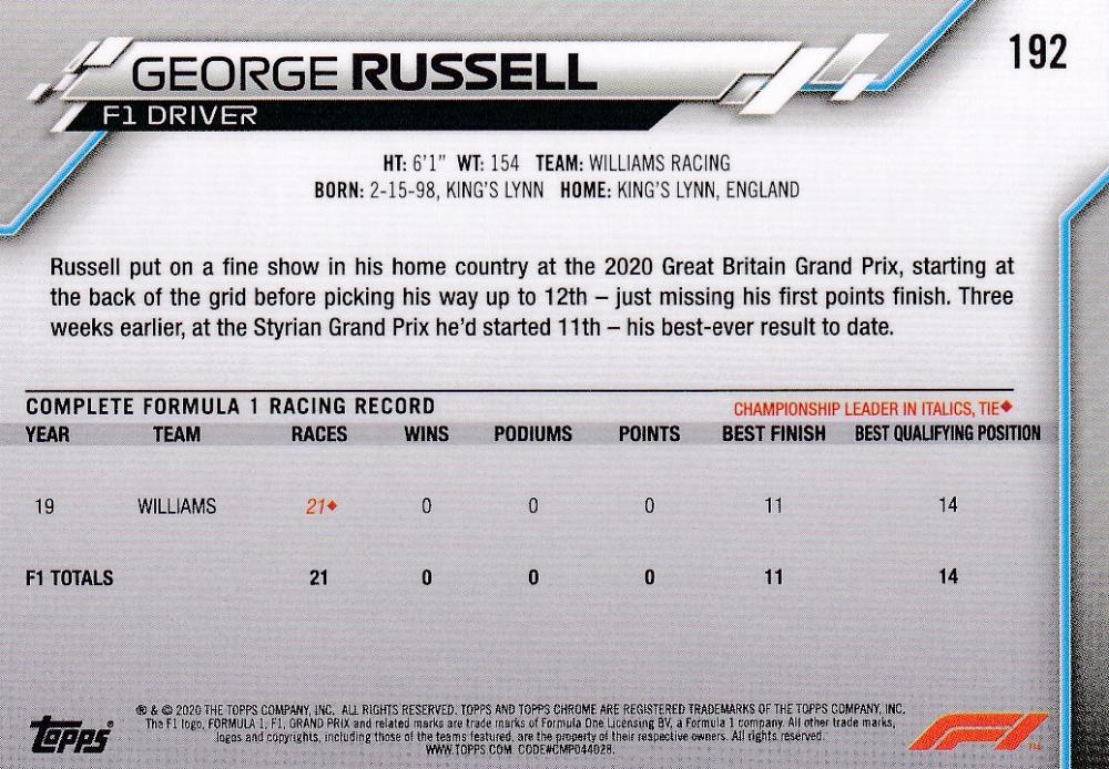 2020 Topps Chrome Formula 1 Williams Racing George Russell F1 Racers Base