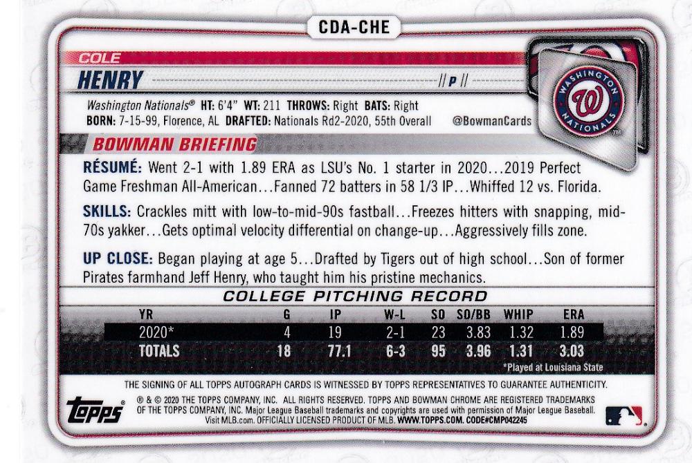 2020 Topps Bowman Draft Washington Nationals Cole Henry Chrome Draft Autographs Blue Refractors (パラレル版) 112/150