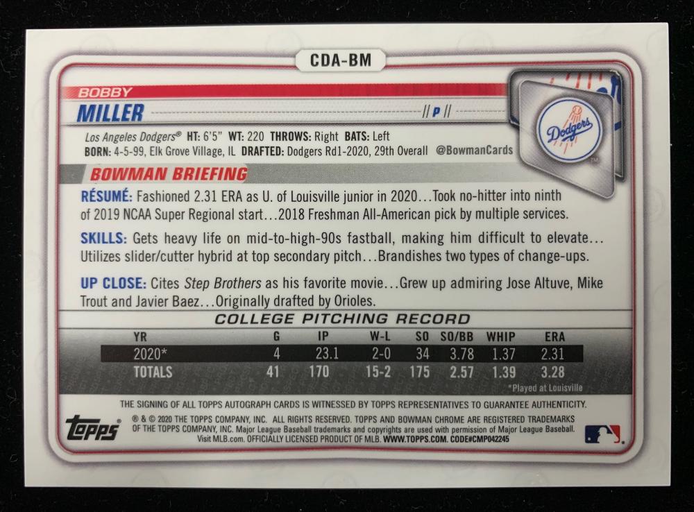 2020 Topps Bowman Draft Los Angeles Dodgers Bobby Miller Chrome Draft Autographs Purple Refractors (パラレル版) 134/250