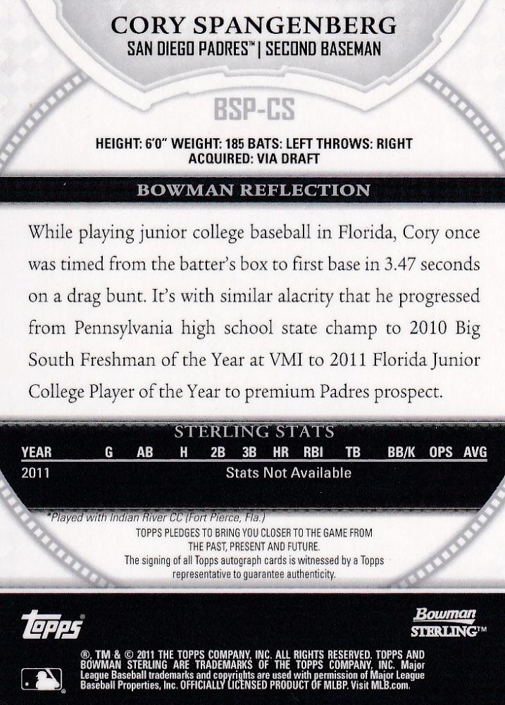 2011 Topps Bowman Sterling San Diego Padres Cory Spangenberg Prospect Autographs