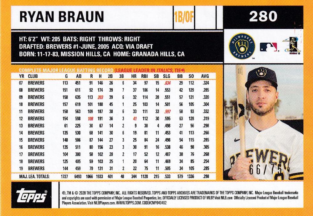 2020 Topps Archives Milwaukee Brewers Ryan Braun Bass 2002 Topps Orange Foil (パラレル版) 66/75