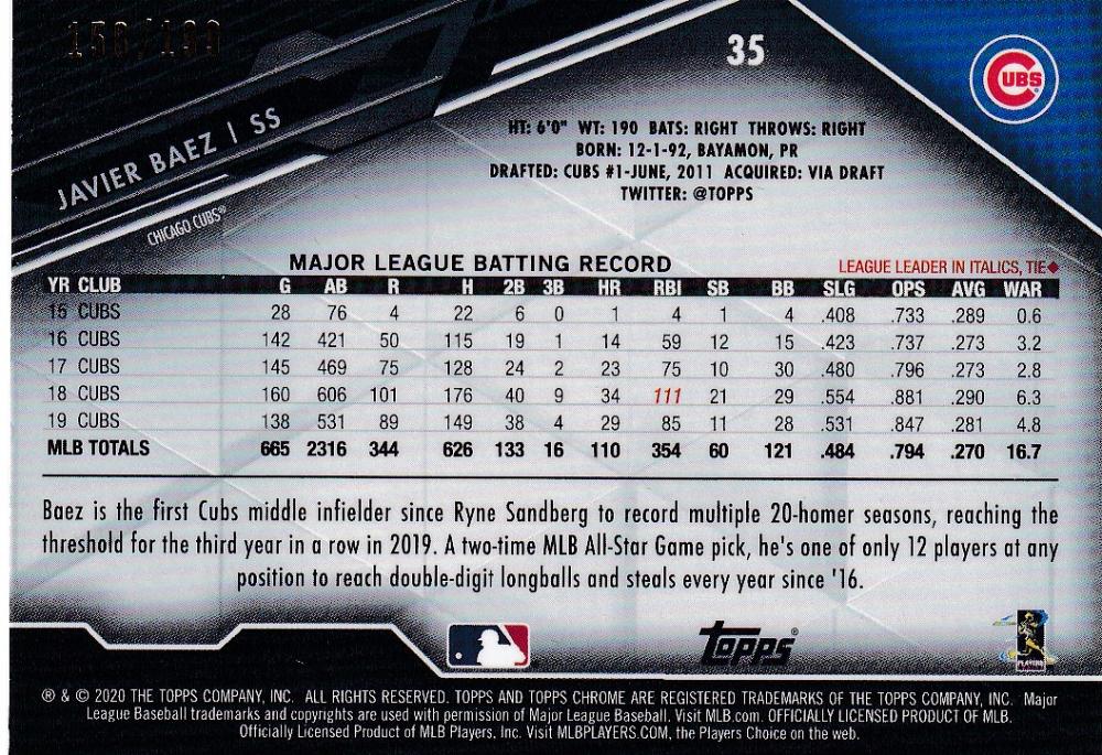 2020 Topps Chrome Black Chicago Cubs Javier Baez Base Refractors (パラレル版) 158/199