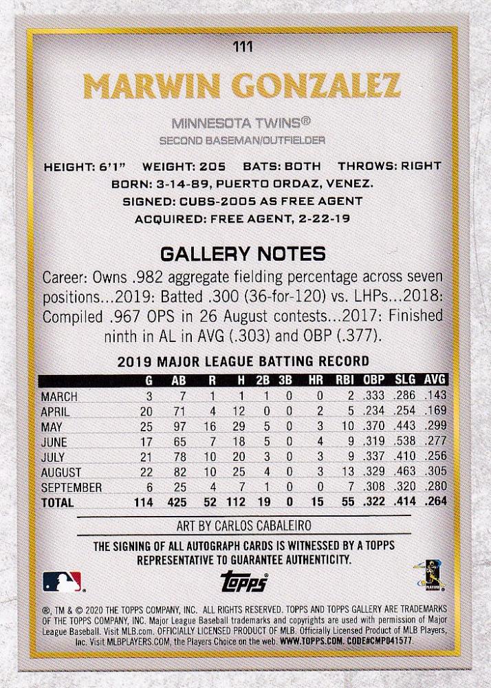 2020 Topps Gallery Minnesota Twins Marwin Gonzalez Autographs
