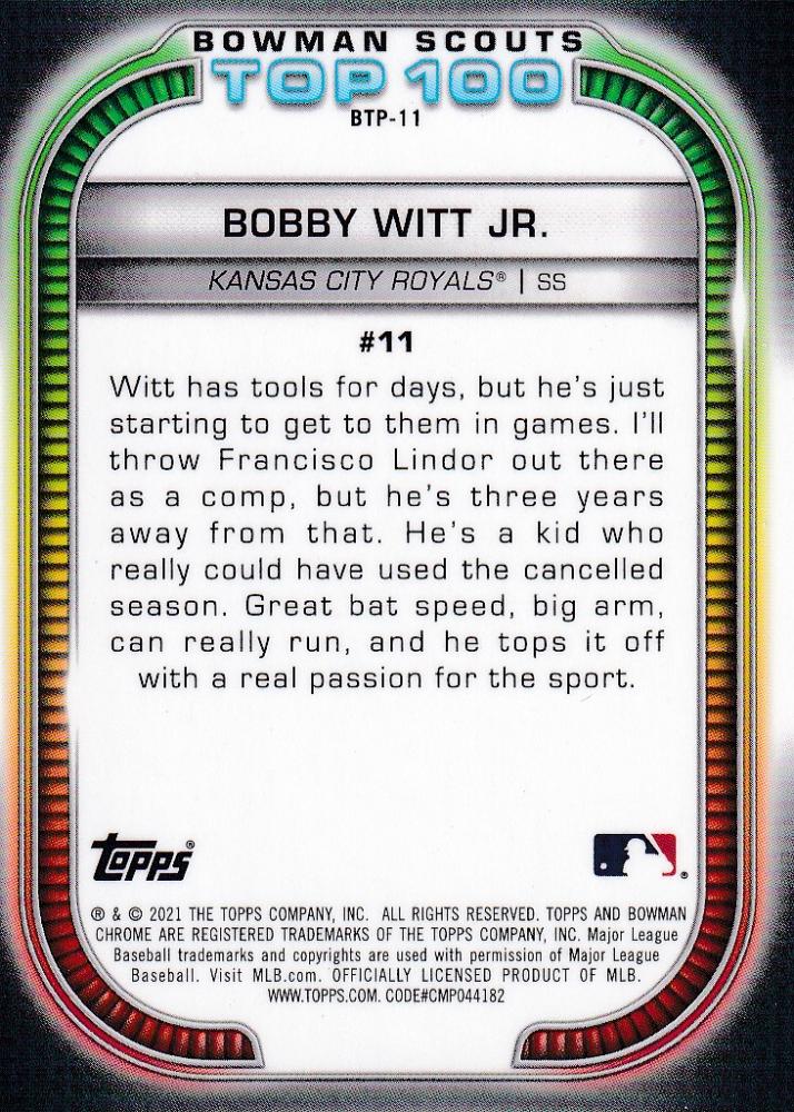 2021 Topps Bowman Kansas City Royals Bobby Witt Jr. Bowman Scout’s Top 100