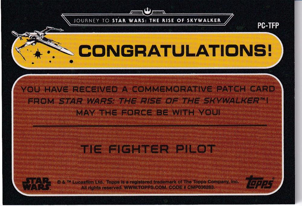 2019 Topps Star Wars Journey to Rise of Skywalker Tie Fighter Pilot Commemorative Patch Relic