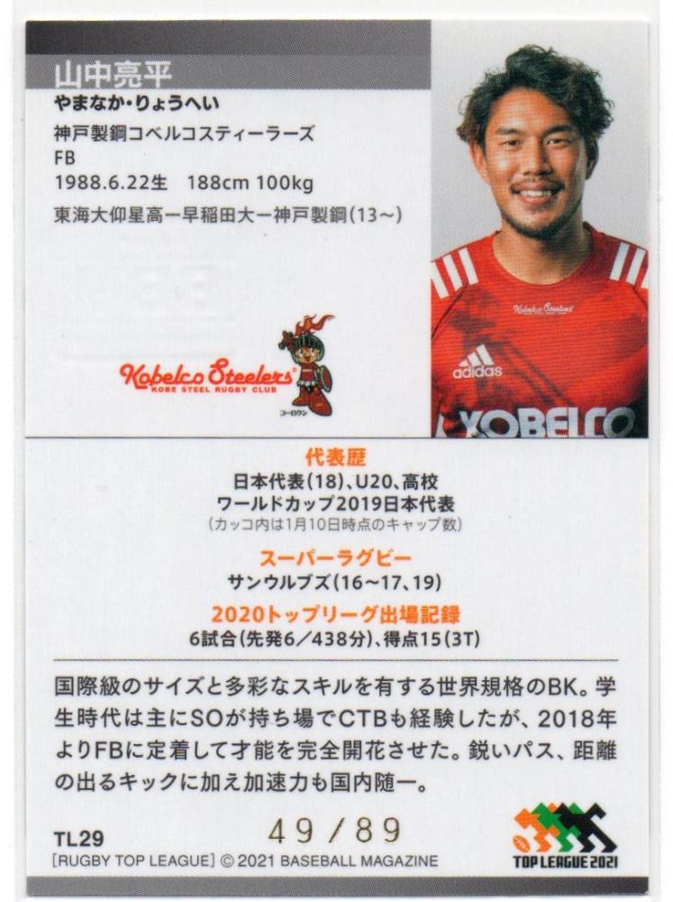 2021 BBM JAPAN Rugby Tops League 神戸製鋼コベルコスティーラーズ 山中亮平 直筆サインカード 49/89