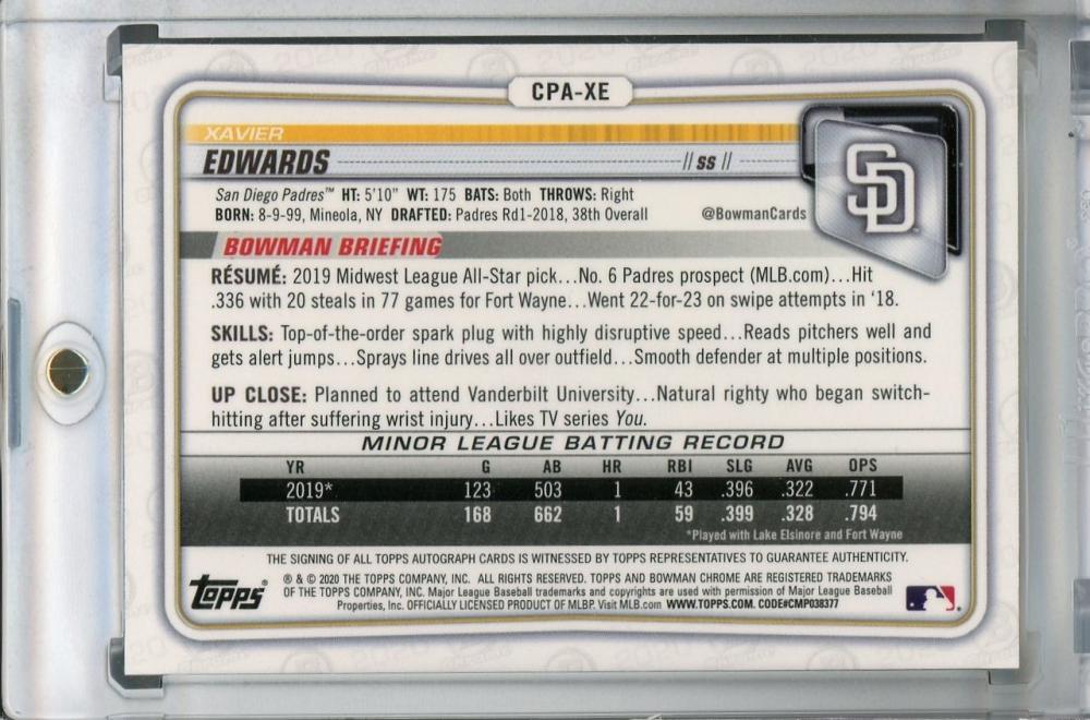 2020 Topps Bowman San Diego Padres Xavier Edwards Chrome Prospect Autographs