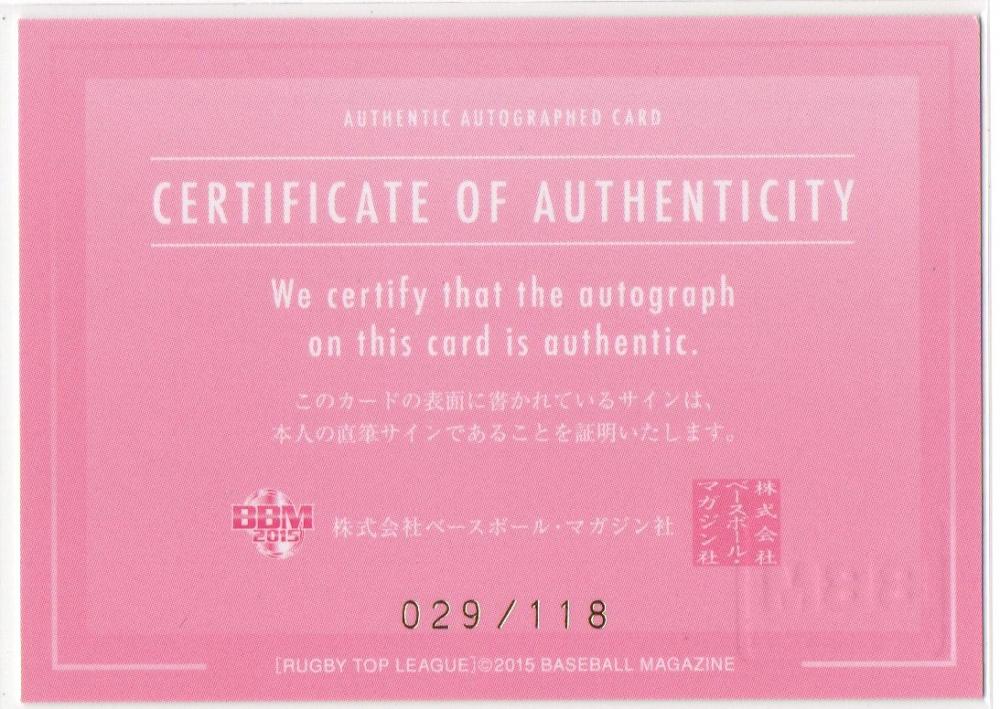 2015-2016 BBM ジャパンラグビー TOP LEAGUE 近鉄ライナーズ 高忠伸 直筆サインカード 29/118