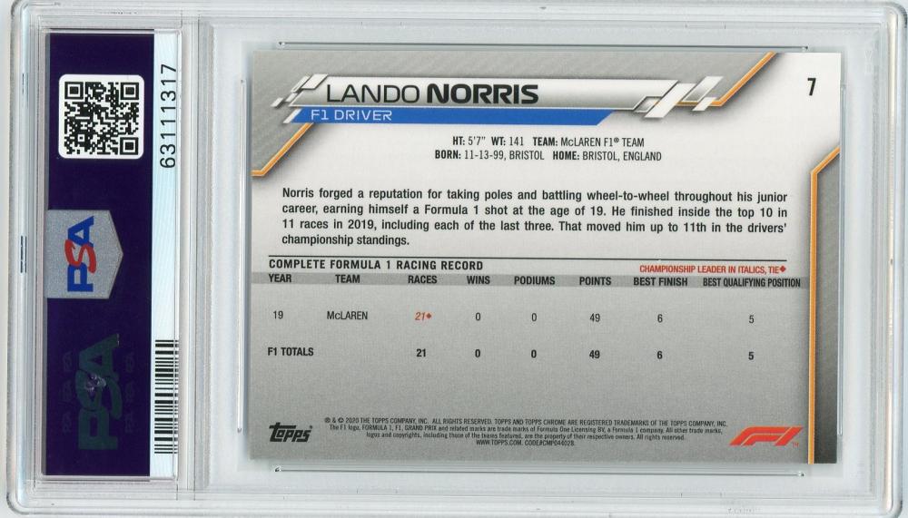 2020 Topps Chrome Formula 1 Racing McLaren Lando Norris Base (RC) (PSA 10)