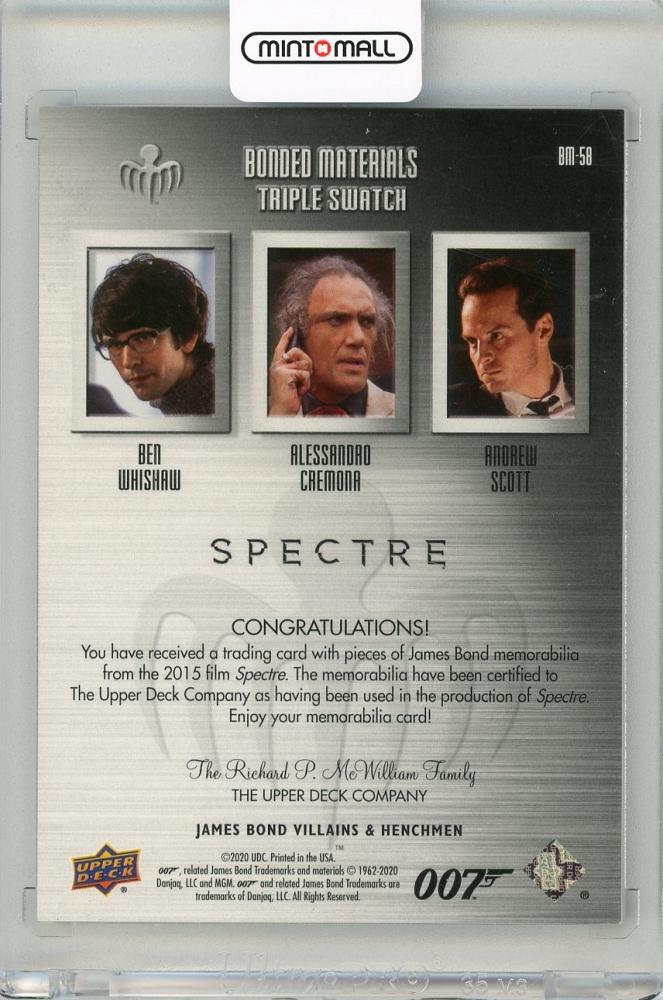 2020 UPPER DECK James Bond Villains and Henchmen Triple Bonded Materials Trios #BM58 Ben Whishaw as Q / Allesandro Cremona as Marco Sciarra/ Andrew Scott as Max Denbigh/ Sweater-Shirt-Suit