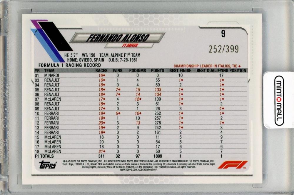 2021 TOPPS Chrome Formula 1 Purple Refractors #9 Fernando Alonso Alpine F1 Team 【252/399】