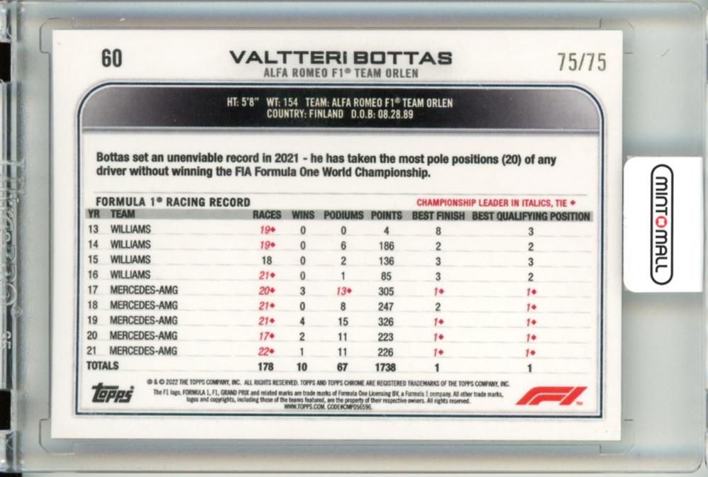 2022 Topps Chrome Fomula 1 Valtteri Vottas #60 Pink Refractor(Lastナンバー!) 75/75