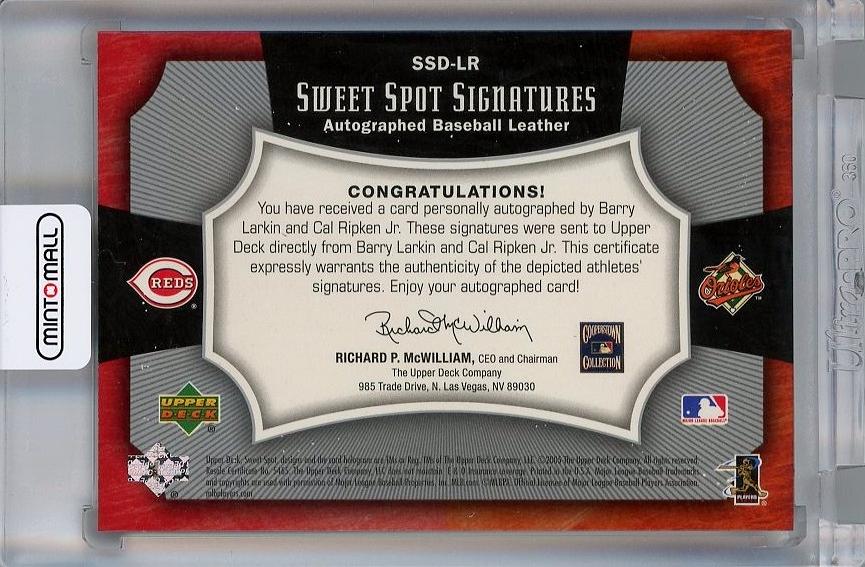 2005 Upper Deck Sweet Spot Barry Larkin / Cal Ripken Jr. Signatures Dual Red-Blue Stitch Auto #LR ※白かけ、インクヤケあり 06/15
