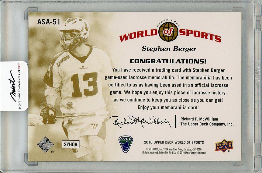 2010 UPPER DECK World of Sports Stephen Berger (Lacrosse) Game Used Memorabilia