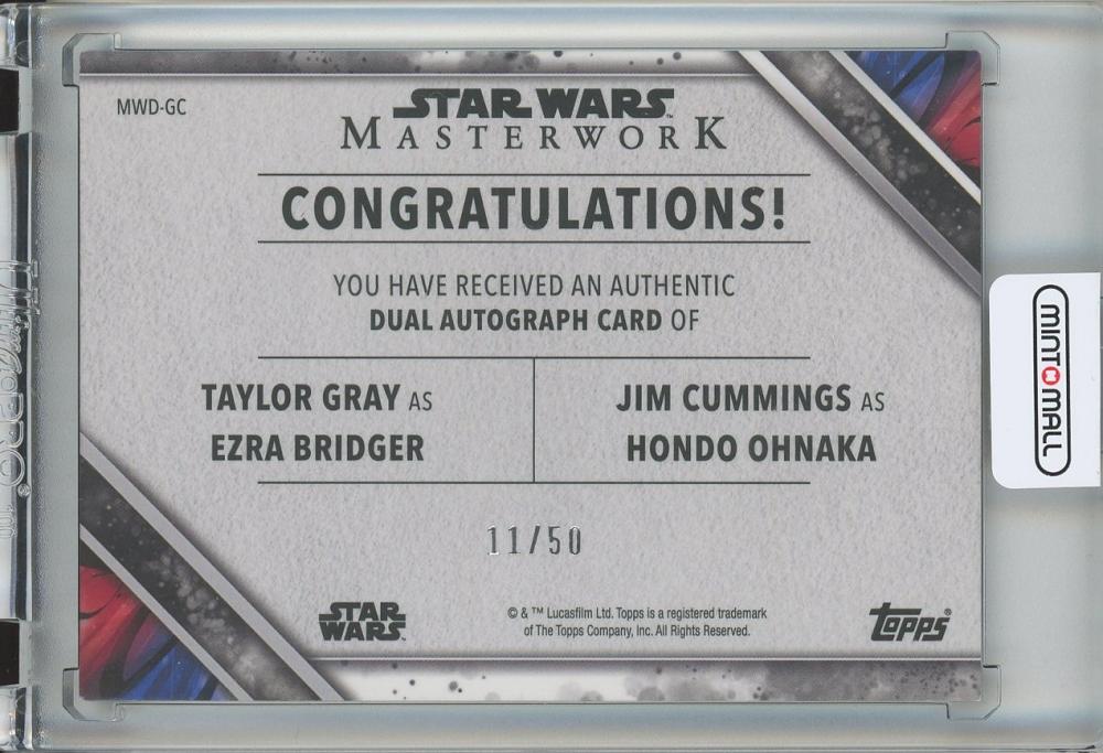 2022 Topps Star Wars Masterwork Taylor Gray as Ezra Bridger/Jim Cummings as Hondo Ohnaka Dual Autographs 11/50