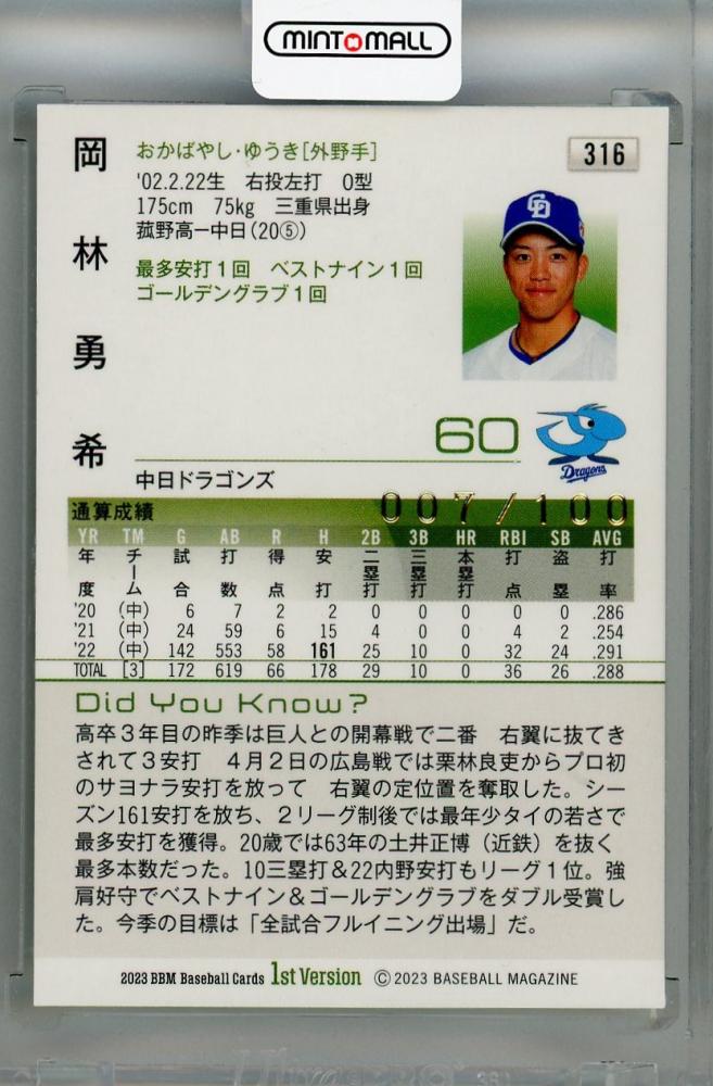 2023 BBM 1st version 中日ドラゴンズ 岡林勇希 レギュラーカード 銀箔サイン版(パラレル版) 007/100