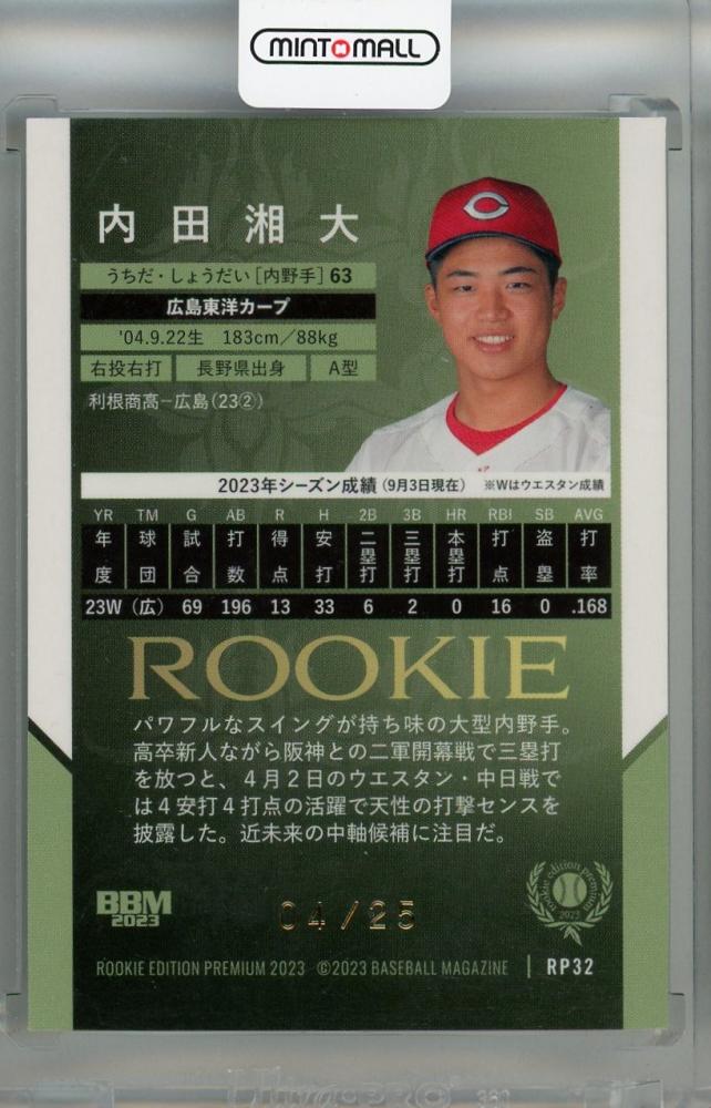 2023 BBM ルーキーエディション プレミアム 広島東洋カープ 内田湘大 レギュラーカード グリーン箔版(RC)(パラレル版) 04/25