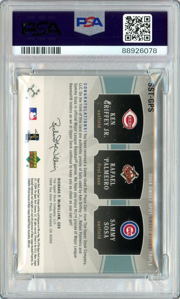 2004 UPPER DECK Sweet Spot Ken Griffey Jr. Rafael Palmeiro Sammy Sosa Sweet Sticks Triple #SSTGPS 50枚限定【07/50】【PSA8】《Near MINT-MINT》