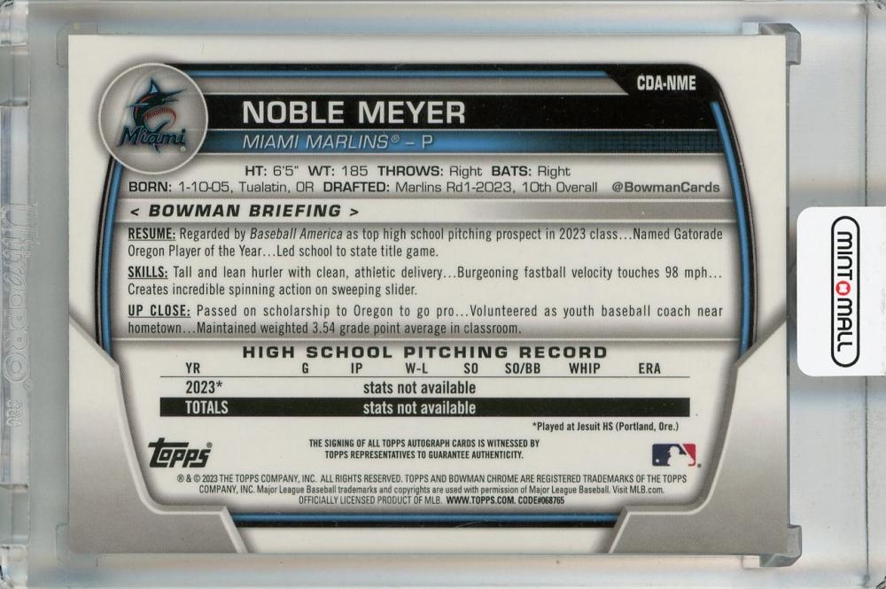 2023 Topps Bowman Draft Noble Meyer Chrome Prospect Autographs #CDA-NME 1st Miami Marlins