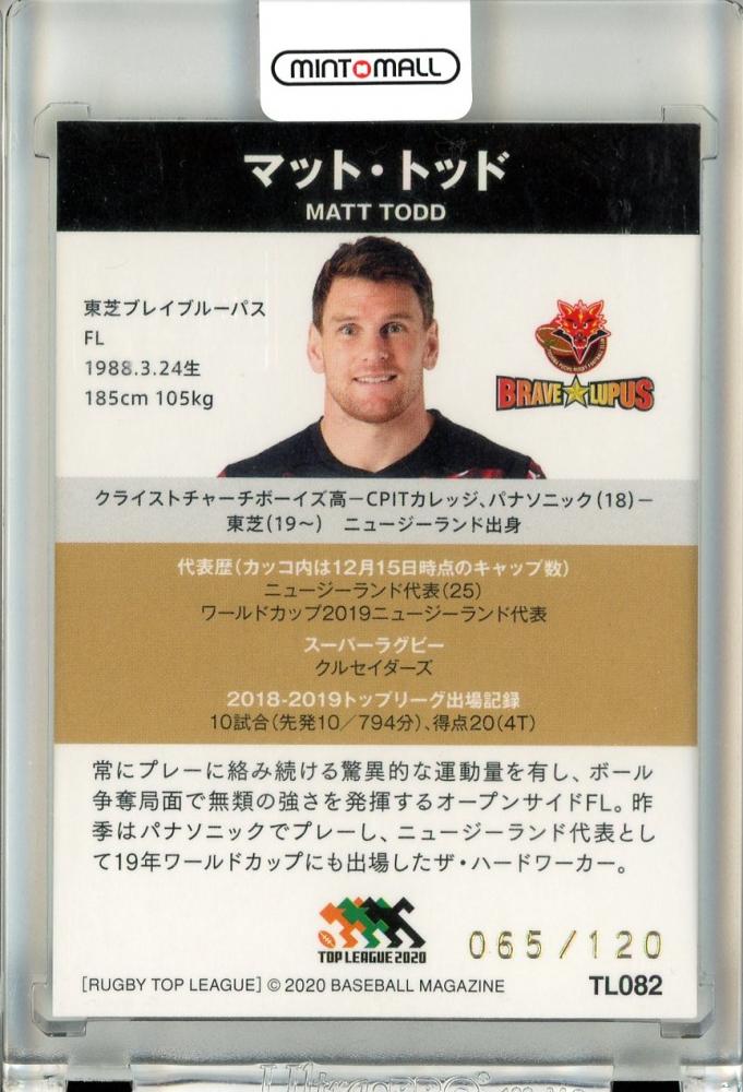 2020 BBM ジャパンラグビー トップリーグカード マット・トッド #TL082 直筆サインカード【065/120】 東芝