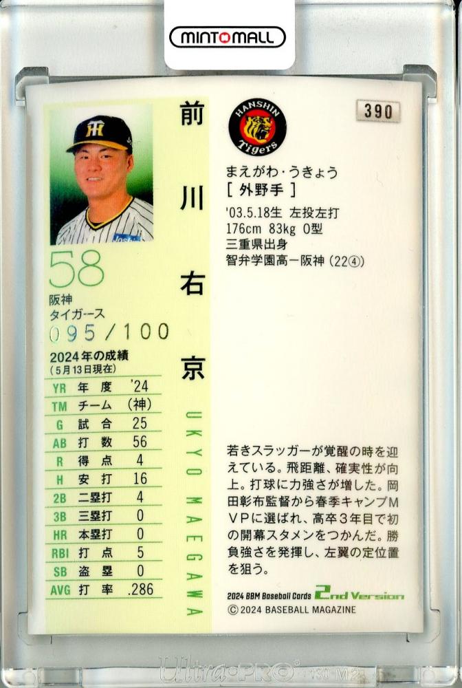 2024 BBM ベースボールカード 2NDバージョン 前川右京 #390 金箔サインカード【092/100】 阪神